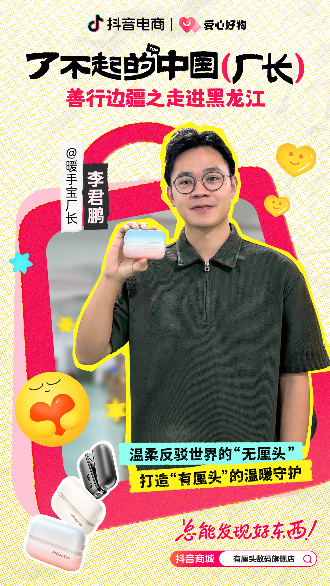 包括李君鹏在内,这个双11,在抖音电商的组织号召下,总计有587位了不起的中国厂长参与了冬日的温暖公益。厂长们挑选优质产品作为抖音电商爱心好物,消费者每成功下单一件,厂长将向壹基金温暖包公益项目捐赠固定善款,三方串起来的爱心公益行动,让源头产业带的中小商家也有机会参与到大型公益当中。